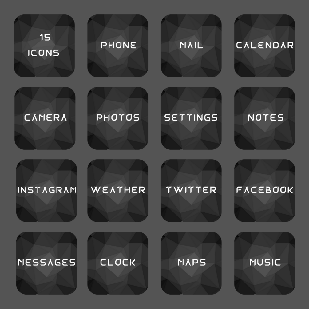 phone, calendar, camera, weather, clock, facebook, instagram, twitter, mail maps, messages, music, notes, photos & settings.